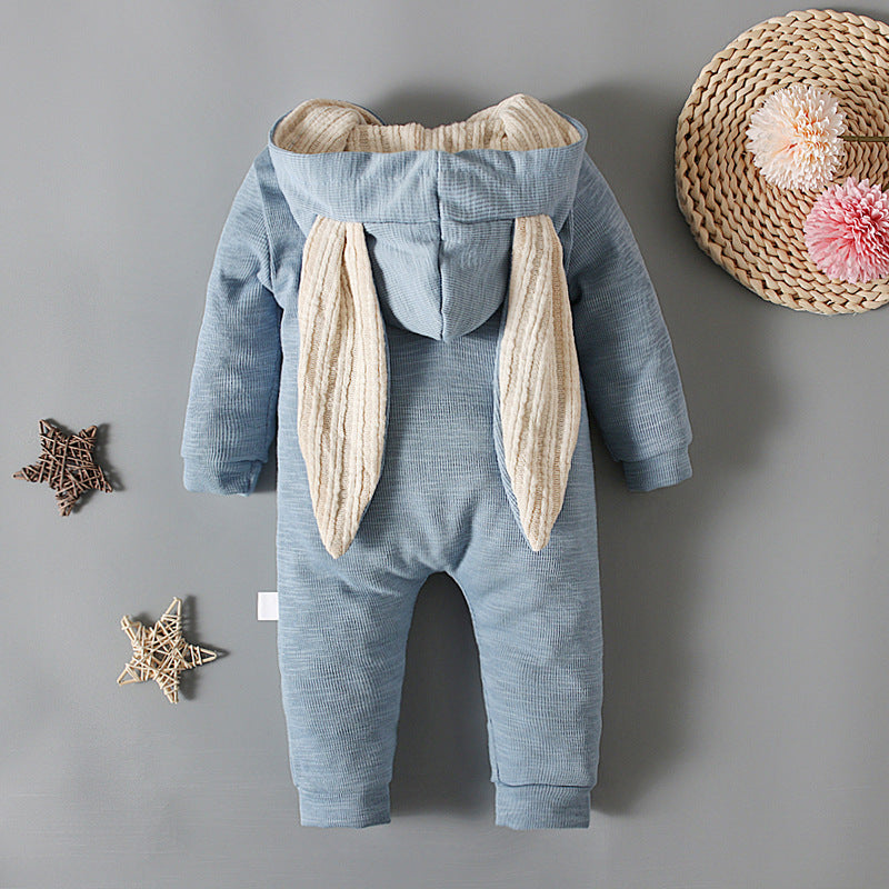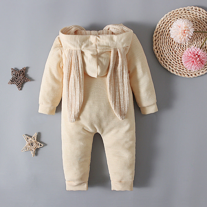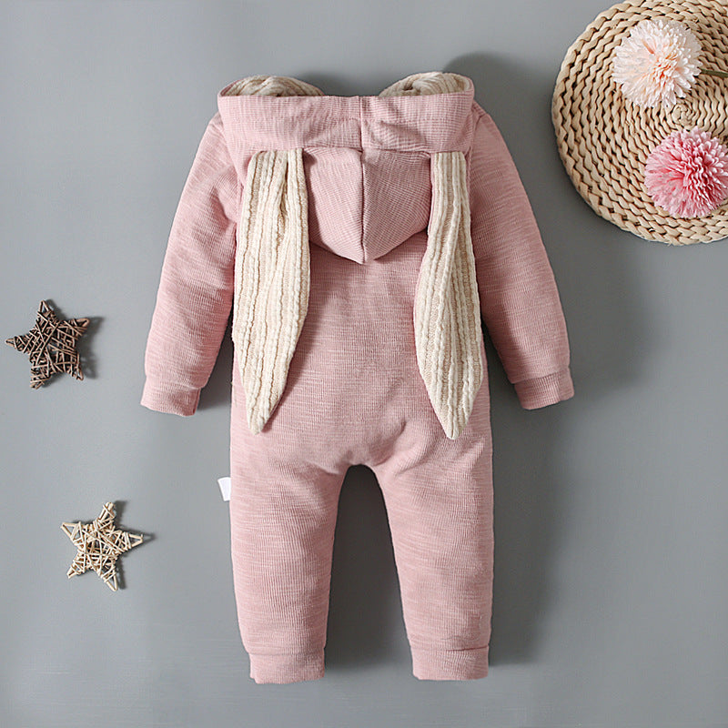 Featuring a long-sleeved design and a convenient front zip opening, it offers easy dressing and a snug fit. The romper is crafted from soft, breathable cotton, making it ideal for year-round wear. Adding a touch of playful whimsy, the lined hood comes adorned with long bunny ears, evoking a sense of delightful fun.