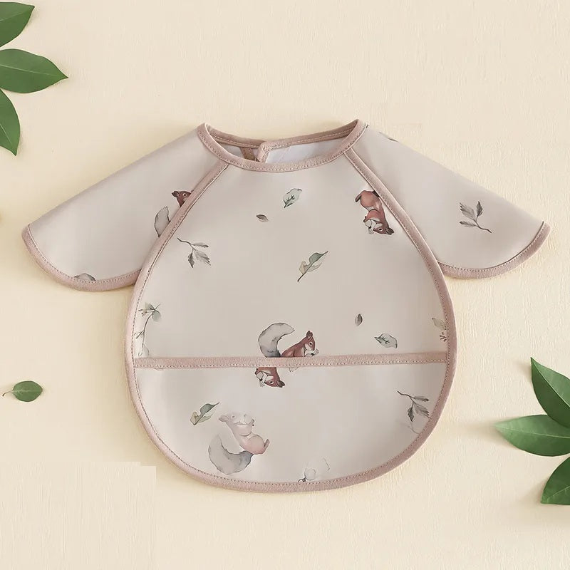 Featuring playful prints in cheerful colors, this bib adds a fun touch to feeding time. The wide coverage design with short sleeves offers extra protection around the shoulders and chest, while the front catch pocket helps trap falling crumbs and liquids.